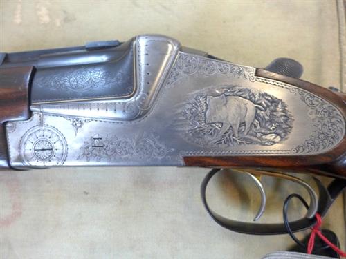 25in. nitro barrels with solid stepped matt top-rib, open sights and ramped blade fore-sight, the breech end with acanthus scrollwork and gold line detail, mounted with a Swarovski 1,5-6x42 Habicht illuminated reticule telescopic sight in quickly-detachable mounts, hold-open toplever, quadruple-grip action with side-clips, gold stud cocking-indicators, manual safety, gold-washed triggers, the front a set trigger, border and acanthus scroll engraving, the lockplates carved in relief with scenes of wild boar and red deer, the underside with a moose, bright and blued finish, the triggerguard gold-inlaid with a monogram 'C.W.', 15in. well-figured pistolgrip stock with cheekpiece, hogsback comb, sling eyes, steel pistolgrip-cap carved in relief with a chamois, steel ammunition trap carved in relief with a bear, and including 3/4in. leather covered recoil pad, weight 10lb. 7oz., in a fitted alloy flight case