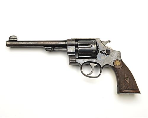 * A .455 SIX-SHOT REVOLVER SIGNED SMITH & WESSON, MODEL 'MKII HAND EJECTOR', serial no. 18412, circa 1912, with sighted 6 1/2in. barrel, solid frame with swing-out fluted cylinder, chequered walnut grip, the right-hand side replaced with a smooth ivory version, traces of original blued finish