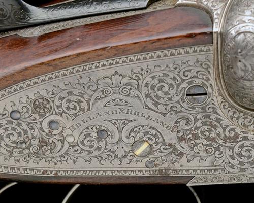 30in. nitro barrels, rib gold-inlaid '1', tubes engraved 'HOLLAND & HOLLAND. 98. NEW BOND STREET. LONDON.' (faint), 2 1/2in. chambers, bored approx. true cyl. and 1/4 choke, right wall thickness below recommended minimum, some dents, toplever gold-inlaid '1', automatic safety with gold-inlaid 'SAFE' detail, gold-inlaid cocking-indicators, best bold Royal scroll engraving, the underside with 'ROYAL HAMMERLESS EJECTOR' in an elaborate cartouche, 14 3/8in. figured replacement stock including horn buttplate, weight 6lb. 9oz.