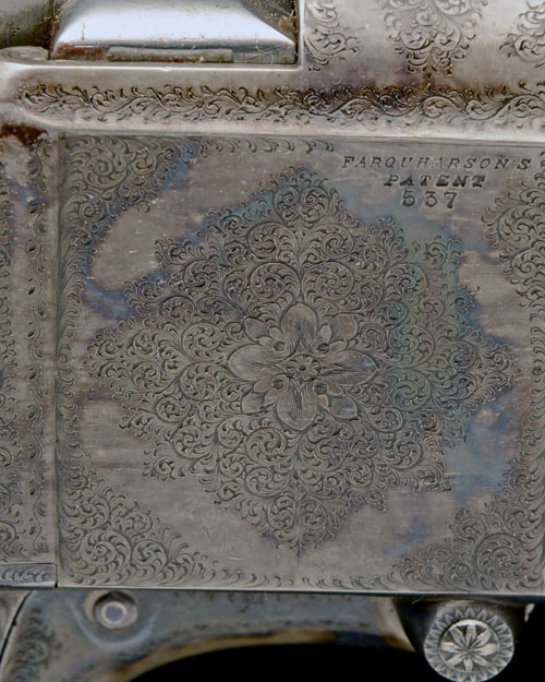 34 3/4in. black powder only barrel engraved 'GEORGE GIBBS, 29, CORN STREET, BRISTOL', the breech end with 'METFORD'S PATENT 1406', full complement of detachable back position match sights in their purple silk and velvet-lined case with gold tooling to lid outer 'METFORD RIFLE SIGHTS G. GIBBS, BRISTOL.', action profusely engraved with fine acanthus scrollwork and with a fine floral design to the standing breech, the left side with 'GEORGE GIBBS BRISTOL' engraved in an elaborate cartouche, the right side with 'FARQUHARSON'S PATENT 537', side mounted cocking lever, retaining much original colour-hardening and finish, 14 1/8in. figured pistolgrip stock with pistolgrip-cap and buttplate, in its full length brass-mounted oak case with some accessories