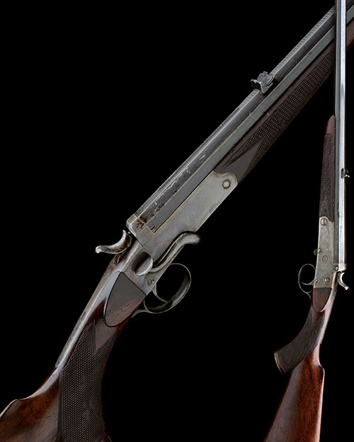 26in. octagonal black powder only barrel with open sights, two folding leaf sights and bead fore-sight, matt top flat with blank cartouche, un-engraved action marked 'W. KAVANAGH & SON DUBLIN' on the left, retaining some original colour-hardening,14 1/8in. pistolgrip stock with steel pistolgrip-cap, weight 4lb. 12oz.