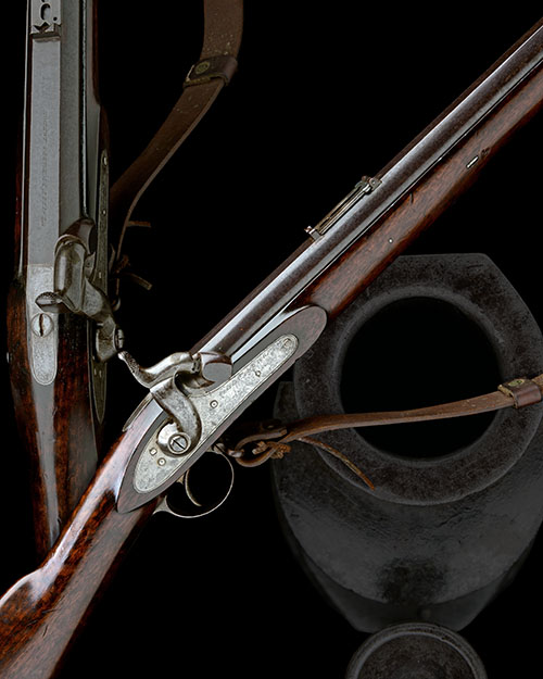 circa 1852, with heavy round 34in. browned barrel rifled with four grooves, full-length broad flat sighting plane signed 'WESTLEY RICHARDS LONDON', shallow block and blade fore-sight, folding ladder rear-sight and additional standing notch rear-sight in separate dove-tails, no visible proofs or inspectors marks, borderline engraved top-tang, borderline engraved bar-action military-style lock signed 'WESTLEY RICHARDS', walnut full-stock with exposed muzzle, iron heel-plate and trigger-guard, two barrel take-down cross wedges, no barrel bands, iron muzzle-cap, no provision for bayonet, cup-headed iron ramrod and fitted with a period leather sling on iron stirrup swivels