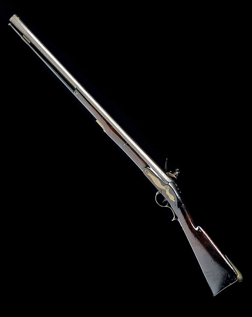 circa 1790, with swamped octagonal iron smoothbore 27 1/2in. barrel, inlet brass bead fore-sight, rear-sight groove cut to the top-tang bisecting an engraved 'Light Infantry' bugle device, borderline engraved bevel-edged lock signed 'MORRIS' at the tail, 'G.R.' crown cypher forwards of the scroll engraved hammer, walnut half-stock, brass furniture including dummy patch-box and spurred trigger-guard tang and bow, iron under-barrel ramrod