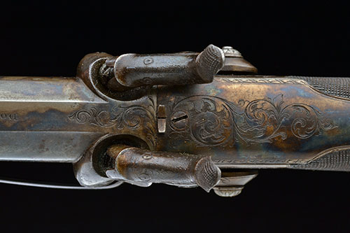 circa 1850, with round colour-hardened London proved 5 1/2in. barrels, flat sighting-plane signed 'DOOLEY N. RANELAGH ST. LIVERPOOL', engraved band at the muzzles, scroll engraving to the breech-end, silver bead fore-sights, standing notch rear-sights to the scroll engraved top-plates, radiused corner border and scroll engraved side-hammer colour-hardened boxlock actions, scroll engraved dolphin-headed hammers, fire-blued sprung belt-hooks to the left hand side, extremely fine chequered walnut butts with engraved colour-hardened butt-caps with centrally mounted trapdoor cap-boxes, scroll engraved trigger-guard bows and captive iron ramrods with scroll engraved stirrups, both pistols remaining in a remarkable state of preservation and appearing little used TOGETHER WITH their manufacturers mahogany storage case, compartmented and lined in green baize (lid re-lined), parchment Dooley trade-label to inside of lid and complete with a number of period accessories including an embossed three-way flask (Riling 461), a scissors ball-mould, a cap-tin, a turn-screw, a nipple-key, an oil-bottle and a mahogany loading rod