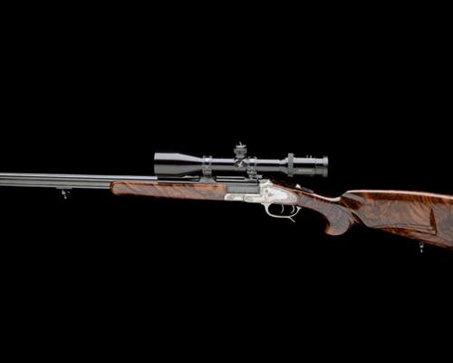 25 1/8in. nitro barrels with border engraved sight rib, folding open sights and engraved ramp-mounted bead fore-sight, the breech end mounted with a Swarovski Habicht 3-12x50 telescopic sight in engraved quickly-detachable mounts, action incorporating Franz Jaeger 1906 patent 'kippblockverschluss' sprung breechblock, manual safety sprung safety / cocking slide, side-mounted barrel selector switch, set triggers, the action, decorative sideplates and furniture finely carved with floral and scroll motifs interspersed with oak leaves and acorns, 15in. unchequered very highly-figured pistolgrip-stock (crack at hand repaired by the makers) with sculpted birdshead grip, sculpted cheekpiece, hogsback comb, sling swivels, 1/2in. rubber recoil pad, slim unchequered schnabel fore-end with Deeley & Edge patent release catch, weight 8lb. 13oz., in a lightweight alloy flight case