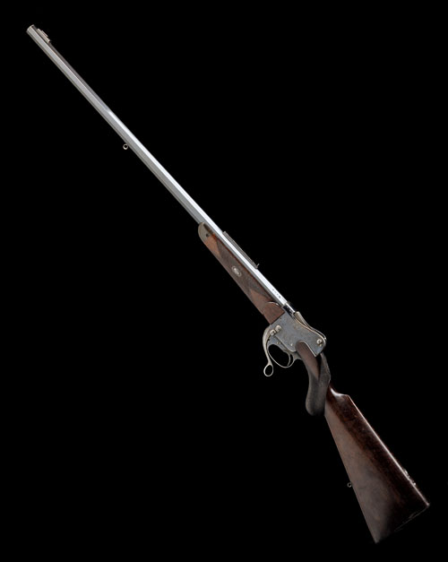30 1/4in. octagonal black powder barrel with finely chequered top flat, two banners engraved 'WESTLEY RICHARDS & CO. LONDON.', and 'LONG RANGE LARGE GAME RIFLE', block mounted fore-sight and express rear sights with silver-inlaid folding leaf sights for 100, 200, 300, 400, 500 and 600 yards, the standing sight for 100 yards marked '100 & 480 Grs', the folding leaf sight for 100 yards marked '120 & 570 Grs', the breech end with the Westley triangle mark, the left of the barrel engraved 'FOR WESTLEY RICHARDS SPECIAL 3IN. TAPER CARTRIDGE. 500 BORE', the action engraved with the Westley triangle and 'WESTLEY RICHARDS & CO. LONDON.' on the left, on the right with 'PATENT', the whole with bold scrolling acanthus motifs, the rear of the action with a matted finish, retaining much original blued finish overall, the underlever and block retaining some original colour-hardening, 15 1/4in. well-figured semi-pistolgrip stock with steel buttplate with trap (brushed finish), sling eyes, detachable bolstered fore-end with horn finial, weight 9lb. 11oz.