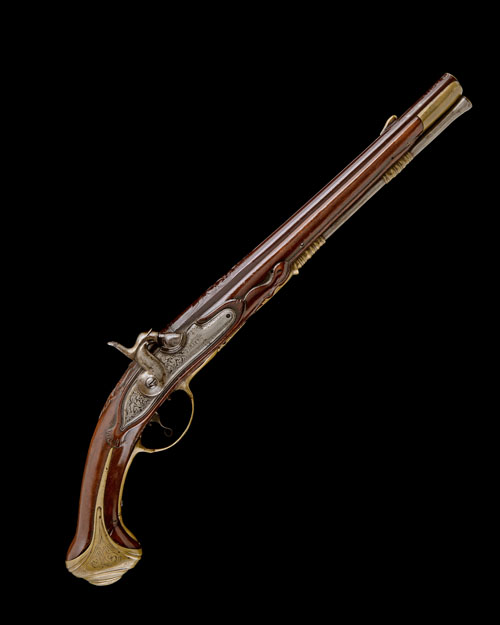 circa 1680 with later conversion to percussion, the browned slightly swamped 12 1/2in. barrels with raised carved sighting plains terminating in deeply carved scrolls at muzzles and forwards of the breeches, applied brass 'droplet' fore-sights, the breech-ends carved with radial bands, raised florally carved rear-sights to the fan-tailed solid top-tangs, curved and heavily radiused borderline and scroll engraved locks signed 'S: ABERG', carved necks to the hammers, walnut full-stocks carved around the lockplates, top-tangs and furniture, swollen butts with scroll engraved heavy long-eared brass butt-caps, moulded brass trigger-guard tangs and bows with floral finials, pierced running vine brass sideplates, moulded and turned ramrod thimbles, brass nose-caps and possible original iron ramrods