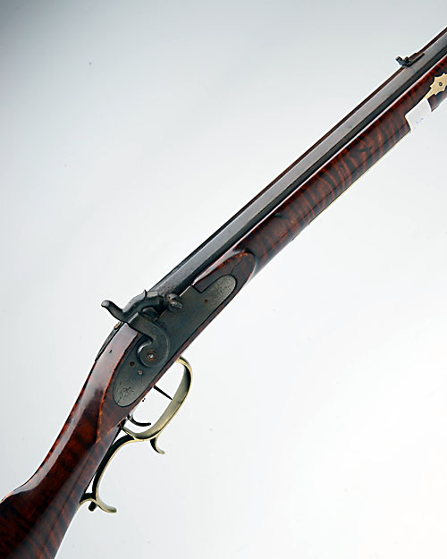 A 54-BORE PERCUSSION SINGLE-SHOT RIFLE, SIGNATURE OBSCURED, MODEL 'PLAINS RIFLE', no visible serial number, North American circa 1845 and possibly signed 'G. GOUGH', with re-blued octagonal 41in. barrel, dove-tailed nickel tear-drop blade fore-sight, dove-tailed standing notch rear-sight, drum and nipple percussion system, flat scroll and game-scene engraved signed lock, scroll engraved hammer, stripey maple half-stock with white-metal furniture including crescent heel-plate with full-length comb protector, butt-mounted patch-pox, trigger-guard bow and spurred tang, the stock with various inlet geometric shapes and an eagle to the cheek-piece, double-set trigger, pewter nose-cap and ebony ramrod