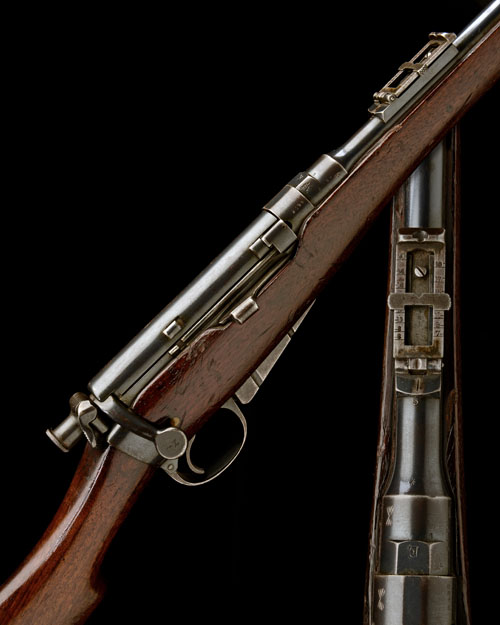 dated for 1896, with blued 21in. barrel, block and blade fore-sight, additional applied bayonet sleeve band to the muzzle, elevating ladder rear-sight, turned-down bolt action receiver with magazine cut-off and safety catch on the cocking-piece, blued dust-cover, walnut butt-stock with side-mounted sling bar, provision for identity disc (removed), brass heel-plate with central trapdoor, five-round magazine, walnut tapering three-quarter fore-end made from three pieces, nose-cap with bayonet bar and provision for clearing rod, (missing), provision for top-wood (missing), complete with its Weapons Collection identity disc