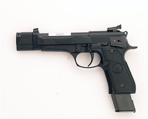 ** A CASED 9mm (PARA) SEMI-AUTOMATIC PISTOL SIGNED BERETTA, MODEL '92 COMBAT', serial no. C70563Z, recent, with 6in. barrel including built-on muzzle-weight, blacked open re-inforced slide, adjustable sights, blacked frame with chequered front and back-straps, single-action match-trigger and black plastic grips TOGETHER WITH its manufactures abs plastic case containing the pistol, paperwork, a selection of magazines (one extended) and a stripping tool, the whole appearing unused.