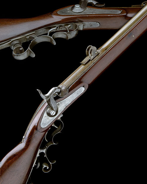 made for the Swiss circa 1850 by Beuret Freres, Liege, with round 33in. rifled barrel, dove-tailed blade fore-sight, elevating tangent rear-sight with wing-nut lock, plain elongated colour-hardened top-tang, plain hump-back lock signed 'BF', plain walnut full-stock with 'roman-nose' comb (repaired through wrist), heavy iron hooked butt-plate, reinforced trigger-guard tang, double-set triggers, finger-spur to the trigger-guard bow, iron roll-tipped nose-cap, iron under-barrel ramrod with captive sliding ball-guides, socket to the right hand side of muzzle for a bayonet and iron sling swivels