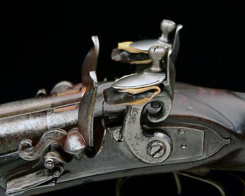 circa 1800, with twist iron 27in. barrels signed on both barrels in gold-lined rectangular poincons at breech in raised letters 'D, CHARTER, BERWICK', fore-sight bead set back from muzzle, twin gold lines and gold lined touch-holes, hooked tang grooved for sighting, slightly curved flat locks with moulded bevel edged and stepped tails, signed forwards of the hammers 'BURNIE', rain-proof pans, roller-bearing to the frizzen-springs, (one hammer repaired and one top-jaw replaced), walnut half-stock (numerous old cracks and repairs around both locks, small losses to left hand edge of fore-end), chequered wrist, iron furniture (cleaned, loss to detail) and period wood ramrod