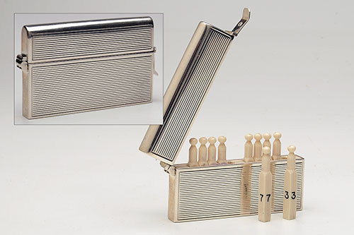 of slim construction, pegs numbered '1' to '10', with silver hallmarks for London