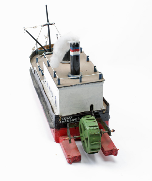 A HOME-BUILT MODEL OF A STEAM CARGO VESSEL, approx. 25in. length overall, appears to be crudely scratch-built and powered by a Mamod single-cylinder steam engine (not tested or certificated).
