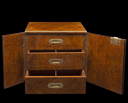 A VINTAGE BRASS-BOUND BURR-WALNUT THREE DRAWER CIGAR CABINET,