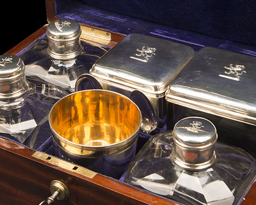 the mahogany case with concealed flush-fitting brass handles, small cigar drawer with flush fitting brass handle, the lid with brass plate engraved with a lion rampant, the purple baize-lined interior containing cut glass decanters, silver sugar container and tea caddy, all with London hallmarks for 1840 and Charles Fox of London, a fine silver beaker with gilded rim and interior with London hallmarks for 1803 and Robert Garrard of London, and a pair of Coburg pattern silver teaspoons with London hallmarks for 1853 and George Adams, each piece engraved with a lion rampant, the case with brass Bramah lock (with key), the whole contained within its fur-lined leather outer
