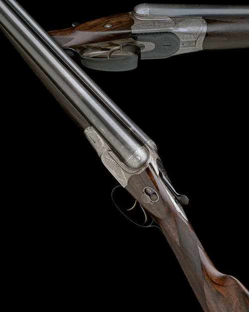 27in. Greener trade mark nitro barrels, fine scroll engraving at the breech ends, rib engraved 'W.W. GREENER. MAKER. 40 PALL MALL. LONDON. S.W. WORKS ST MARY'S SQUARE. BIRMINGHAM.', 2 1/2in. chambers, bored approx. imp. cyl. and 1/4 choke, treble-grip action with ropework-engraved shoulders, automatic side-safety with gold-inlaid 'SAFE' detail, rolled-edge triggerguard, fine acanthus scroll engraving, retaining traces of original colour-hardening, 14 1/2in. stock (setting crack to left side) with wooden toe extension, fore-end with Deeley & Edge patent release catch and horn finial, weight 6lb. 5oz., in its lightweight leather 'violin' case with gold-tooled red leather trade label