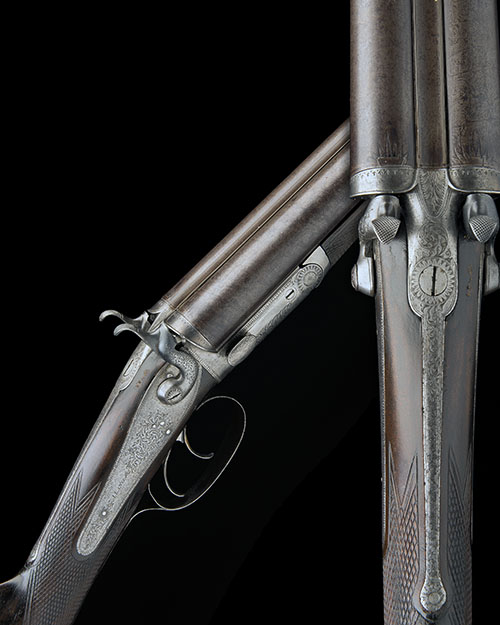 converted from pinfire, 28 1/4in. nitro reproved bold damascus barrels, rib engraved 'J. LANG. COCKSPUR STREET. LONDON', the breech ends with starburst details and pinfire apertures plugged, 2 3/4in. chambers, bored approx. true cyl. and imp. cyl. choke, wall thicknesses below recommended minimum, narrow carved fences of pinfire form, action with T.P. Saville patent spring-operated transversely-sliding locking bolt mechanism, patent no. 1559 of 22nd June 1864, non-rebounding back action locks, beaded border and bold acanthus scroll engraving, the underside marked 'Lang's Patent No. 43', some wear overall, 14 5/8in. well-figured stock including steel buttplate, repairs to fore-end, weight 6lb. 4oz.