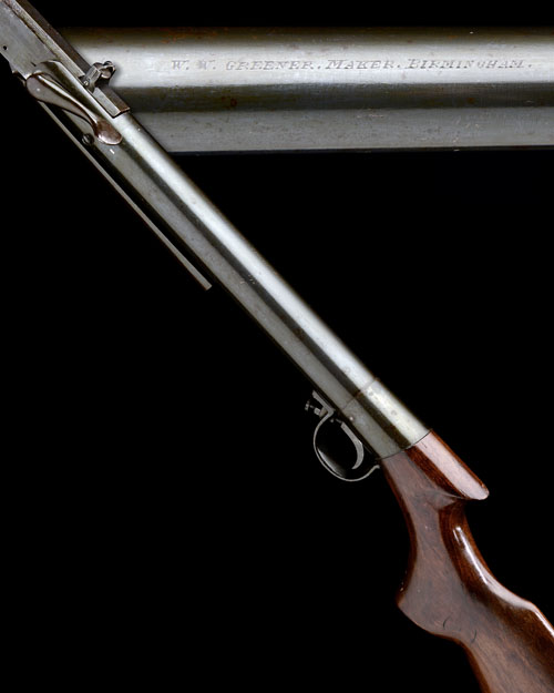 circa 1930, with blued 20in. barrel, ramp and dove-tailed blade fore-sight, elevating notch rear-sight, cam opening lever mounted to the left hand side of breech, plain blued air-chamber signed 'W.W. GREENER, MAKER, BIRMINGHAM', slightly flared trigger-unit housing, un-chequered walnut butt with saw-back pistol-grip, iron heel-plate and trigger-guard bow, rounded iron cocking-lever, the whole with much original finish under dried, hardened oil