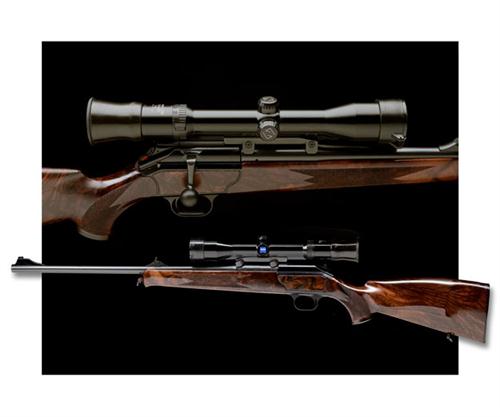22in. nitro barrel with block-mounted open sights and ramp-mounted blade fore-sight, the receiver mounted with a Zeiss Diavari-ZM 1,5-6x42 T* telescopic sight in quickly-detachable mounts, black finish, the receiver with wooden side panels, highly-figured pistolgrip stock with sculpted cheekpiece, hogsback comb, sling swivels, 14 1/2in. pull including buttplate, in its Blaser take-down case