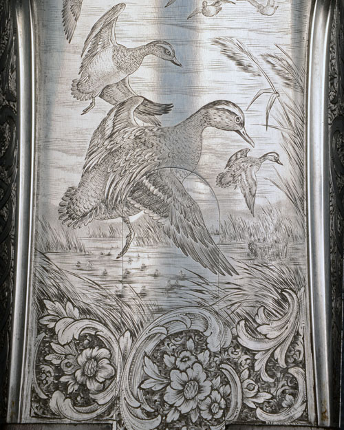 hold-open toplevers, automatic safeties, non-selective single triggers, actions, furniture and lockplates with very fine scrolling acanthus and coiled scroll bordering, interspersed with floral bouquets, surrounding and invading finely engraved wetland set scenes of wildfowl in bulino style, the triggerplates signed 'A Galeazzi', the triggerguards with cartouches gold-inlaid '1' and '2', 14 5/8in. highly-figured semi-pistolgrip stocks, with interchangeable highly-figured straight hand stocks (with triggerguards) in their individual stock cases, the fore-ends engraved en suite and inlaid in gold with the Bosis crest, weight 7lb. 7oz. (27 1/2in. barrels) and 8lb. (30in. barrels), in their leather motor case with provision for all sets of barrels, with accessories