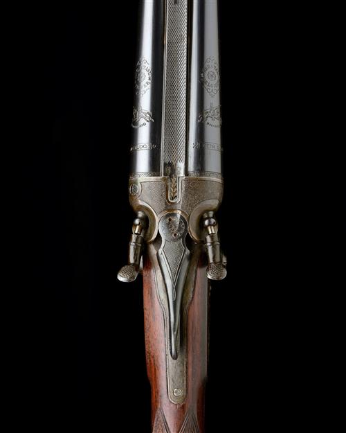 27 1/2in. nitro barrels, raised matt rib inscribed 'POUR POUDRE VIVES', the breech ends with the Cavalier and Bayard inscription, 'DEMI-BLOC' and with the 'ANC. ETABL. PIEPER' 'HERSTAL BELGIQUE' roundels, 2 1/2in. chambers, bored approx. full choke in both, treble-grip action, carved percussion fences, rebounding back-action sidelocks, gold-washed triggers, bold foliate engraving, the action bar with hounds, retaining virtually full colour-hardening and finish13 7/8in. stock with sling swivels and including buttplate, chequering refreshed, weight 5lb. 10oz.