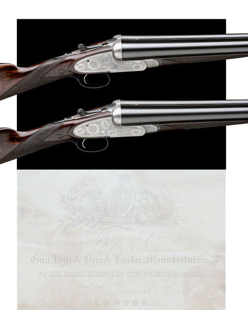 28in. nitro barrels, ribs gold-inlaid '1' and '2' at the breech ends and engraved 'BOSS & CO. 73. ST. JAMES'S STREET. LONDON.', 2 1/2in. chambers, bored approx. imp. cyl. and 1/4 choke, wall thicknesses below recommended minimum, some rivelling, toplevers gold-inlaid '1' and '2', manual safeties with gold-inlaid 'SAFE' details, gold-inlaid cocking-indicators, non-selective single triggers, rolled-edge triggerguards, best fine floral bouquet and acanthus scroll engraving, the triggerplates with Boss 1894 patent single trigger details, brushed bright and reblued finish overall, 14 3/4in. highly-figured replacement stocks, weight 6lb. 7oz., in their re-lined brass-cornered oak and leather case
