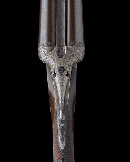 28 3/8in. (72cm) fine nitro reproved damascus barrels by V. Lemal, raised finely matted rib, 2 3/4in. chambers, bored approx. 1/2 and full choke, scroll-back treble-grip action with carved arcaded oak leaf fences and side-clips, pierced acanthus toplever engraved with a retriever with partridge, manual safety with viewing port, fine acanthus border engraving surrounding scenes of hound attacking boar on the left, fox and hounds on the right, the underside with hounds and hare and inscribed 'J. PIQUET - LEON ARMURIER A ST. TROND', the triggerguard with hound and stag, bright finish overall, 14 1/2in. well-figured pistolgrip stock , sling eyes removed, including 3/4in. rubber recoil pad, highly-figured replacement fore-end wood, weight 6lb. 10oz.