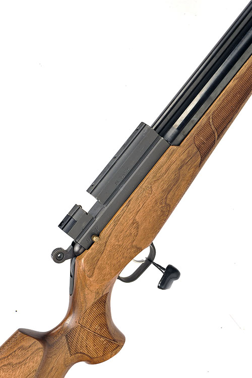 AN FAC-RATED .22 PRE-CHARGED PNEUMATIC REPEATING AIR-RIFLE SIGNED DUK IL ARMS CO., MODEL 'HUNTING MASTER AR6', serial no. DL1855778, with 26 1/2in. floating barrel with moderator adaptor, anodised receiver with external hammer and aperture for rotary magazine (missing), blued air reservoir and chequered walnut half-stock