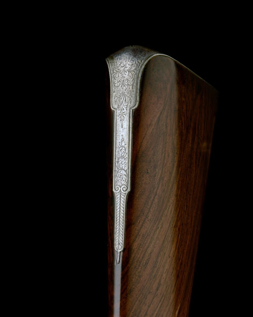 28in. bold damascus barrels (shortened), rib engraved 'CHARLES LANCASTER. 151 NEW BOND ST. LONDON. PATENT BREECH LOADER', Charles Lancaster patent slide-and-tilt action with patent rotary-underlever, recessed bosses, broad striker discs, non-rebounding back-action locks, hammers with spurs of hare's-ear form, best bold acanthus scroll engraving, the triggerguard with two pointers, the triggerguard tang with a nye of pheasants, retaining very slight traces of original colour-hardening and finish, 14 3/8in. highly-figured stock including steel buttplate with back strap, fore-end with crosspin release and horn finial, weight 7lb. 4oz.