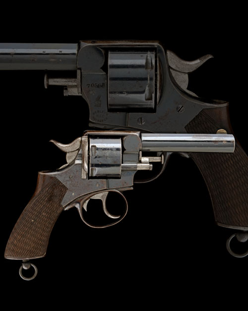 circa 1880, with blued ovoid 4 1/2in. barrel, nickel fore-sight, the topstrap signed 'ARMY & NAVY CSL' and machined with a sighting groove, ejector rod stored in the cylinder arbour, plain blued cylinder with rear locking notches, solid iron frame marked with the winged bullet Webley trademark and stamped 'WEBLEY'S RIC No1 .450CF' in an oval, coarsely chequered one-piece walnut butt, iron heel-plate and central lanyard ring, much original finish remaining