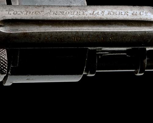 pre 1872 and of Philip Webley style, with blued 6in. octagonal barrel with side-mounted ejector-rod, dove-tailed blade fore-sight, sighting groove to the top-strap, the top-strap signed 'LONDON ARMOURY, JAS KERR & CO, 54 KING WILLIAM ST. E.C.', plain blued cylinder with rear ratchet locking, solid iron frame marked 'B.L. 709' and 'ADAMS PATENT' with the serial number, bottom hinged loading gate with locking catch, one piece chequered saw-handled walnut grip, iron butt-cap and ring for lanyard loop, strong traces of finish throughout