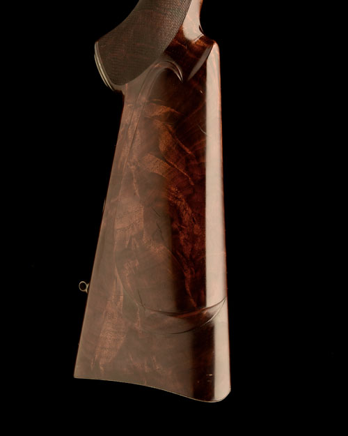 22 1/8in. nitro barrel engraved in script 'K.J. SPIBEY. KNUTSFORD. CHESHIRE' and foliate scroll detailing, matt sight rib with two folding leaf sights, ramp-mounted bead fore-sight, scroll-engraved receiver mounted with a Zeiss Diavari-C 3-9x36MC telescopic sight in engraved quickly-detachable mounts, manual tang safety, hinged floorplate with push button release, scroll engraved and with central depiction of a barking stag, the triggerguard with a mouflon, highly-figured pistolgrip stock with cheekpiece, decorative chequering borders, horn fore-end finial, engraved steel pistolgrip-cap, sling eyes, 13 1/2in. pull including chequered steel buttplate