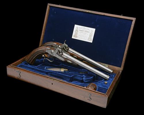 circa 1845, with fine damascus 10in. barrels, dove-tailed blade fore-sights, scroll engraved breech-blocks, scroll engraved top-tangs with standing notch rear-sights, borderline and scroll engraved hump-back locks with stepped tails and signed 'F IN P LE PAGE A PARIS' beneath the hammers, figured walnut half-stocks with fluted flaring butts, engraved iron caps, engraved finger-spurred trigger-guard bows, white-metal barrel-key escutcheons and scroll carved fore-end tips, no provision for ramrods, TOGETHER WITH a period, possibly original walnut storage case, re-lined internally with blue velvet in the continental manner and complete with a full suite of period accessories including a powder-flask with ribbed copper body, a walnut loading mallet, a scissors ball-mould, a nipple key and wood loading rod, the case with reproduced 'LE PAGE FRERES' trade-label