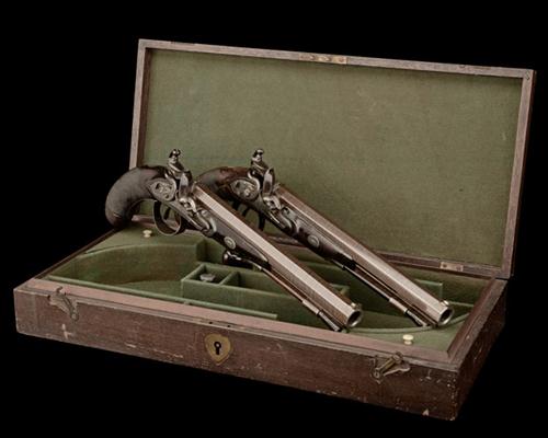A CASED PAIR OF 25-BORE FLINTLOCK DUELLING-PISTOLS, no visible serial numbers,