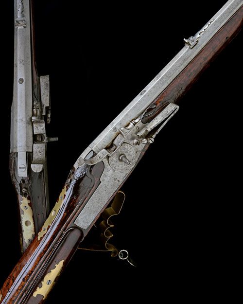possibly Dutch or German, circa 1700, with swamped octagonal 33in. barrel, the breech deeply struck with a oval city proof-mark, provision for dove-tailed fore-sight (missing), standing notch rear-sight with additional folding leaf, engraved ball-band forwards of the solid squared top-tang, large flat angular lockplate, the wheel-cover engraved with a two-headed eagle, missing cock and linkage, unidentified makers stamp, walnut full-stock with triangular form butt, inlet rococo brass panels, provision for aperture sight behind tang (missing), carved border around lock and brass sideplate, sliding brass inlaid patchbox lid, horn heel-plate with iron heel button, brass finger-grooved trigger-guard, set trigger with 'hogs-bristle' release (broken), missing nose-cap and front ramrod pipe, ramrod absent (ironwork cleaned, some worm and other small losses throughout), the cheekpiece retaining its Weapons Collection plaque and identity disk wired to trigger-guard