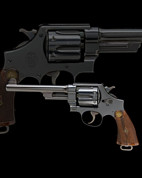 first year of production,1908, with blued 6 1/2in. barrel signed and with patent dates to 1906, period London proofs, block and crescent fore-sight, sighting groove to the top-strap, blued solid frame with swing-out fluted cylinder, colour-hardened hammer and trigger, chequered walnut two piece grips, the tops inlet with an embossed 'S&W' medallions, lanyard swivel to heel, the whole in a remarkable state of preservation retaining practically all its original deep blue factory finish and appearing unfired; TOGETHER WITH a British hardshell revolver holster for the Sam Browne belt, fitted with internal loops for a cleaning rod (missing)