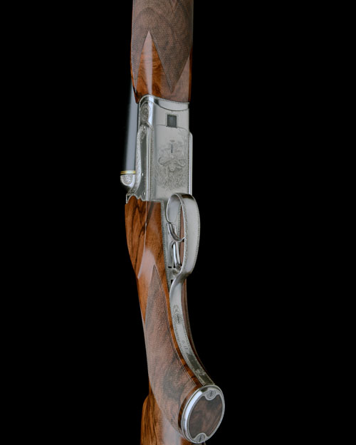 24in. nitro monobloc barrels with raised matt sight rib, finely matted open sights and two folding leaf sights with gold-inlaid sight lines and marked for 50, 100 and 150 metres, broad sunken rib gold-inlaid with the calibre designation, ramped bead fore-sight, the left tube gold-inlaid 'LUCIANO BOSIS BRESCIA - ITALY' and with two gold bands at the breech ends, bolstered scroll-back action with carved arcaded fences, removable striker discs, the toplever pierced with a dragon, manual safety with gold-inlaid 'SAFE' detail, articulated front trigger, fine acanthus scroll engraving with chequered and rococo bordering, the underside with a portrait of a cape buffalo in bulino style, initialled 'A.G. INC.', bright finish overall, 14 3/4in. highly-figured pistolgrip stock with cheekpiece, finely engraved skeletal steel pistolgrip-cap, sling eyes and including 3/4in. rubber recoil pad, beavertail fore-end finely inset in gold with the Bosis crest, weight 9lb. 12oz., in its brass-cornered leather case with accessories