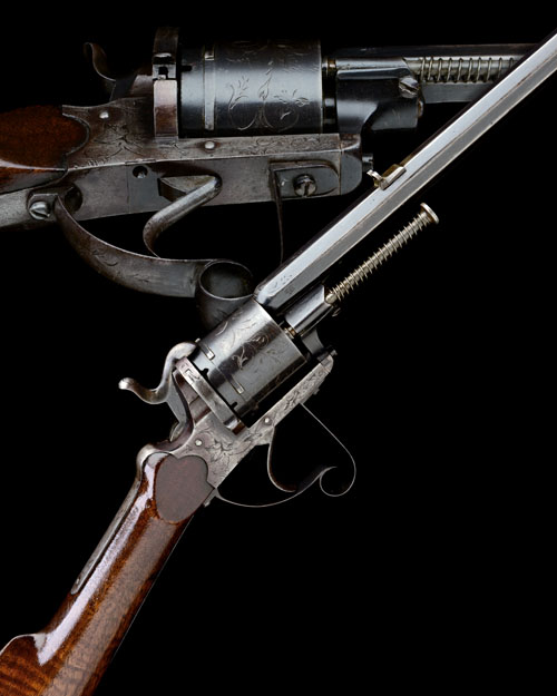 Belgian or Spanish circa 1855, with octagonal 25 1/2in. barrel, bead fore-sight, standing notch rear-sight, plain cylinder with scroll engraving and rear ratchet locking, open frame with hinged loading gate and ejector rod on the right hand side, single action hammer, figured walnut straight-hand butt-stock, iron heel-plate and flat-fronted oversize trigger-guard bow