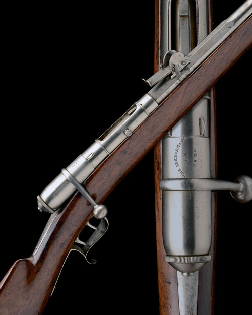 circa 1868, with octagonal to round 33 1/2in. barrel 'in the white', the top-flat signed 'J.U. BANZIGER, ST CALLEN', ramped dove-tailed fore-sight, elevating rear-sight on a tangent scale, cylindrical receiver with turned down bolt-handle, the housing signed 'IOHS LENDERMANN IN GRUB', walnut three-quarter stock with heavily curved iron heel-plate, finger-spurred trigger-guard bow, large iron nose-cap and iron clearing rod, the side of muzzle fitted with a bayonet bar