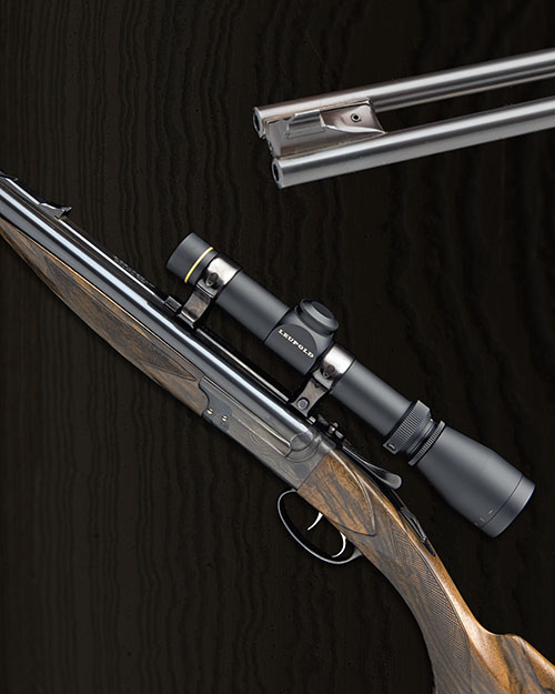22 1/2in. nitro reproved partially ribless barrels, raised sight rib engraved 'B. BRADSHAW. DIANA, TX. .22 HORNET' with open sights, ramped bead fore-sight, the breech end mounted with a Leupold telescopic sight in quickly-detachable mounts, scale damascus steel action with carved fences and side-clips, removable striker discs, manual safety with brass 'FIRE' detail, toplever with peepsight, blacked finish, 15 1/4in. highly-figured pistolgrip stock with sling eyes and skeletal steel pistolgrip-cap and buttplate, fore-end release plate and iron also blacked damascus steel, weight 6lb. 15oz., in a Pelican 1700 desert tan rifle transit case