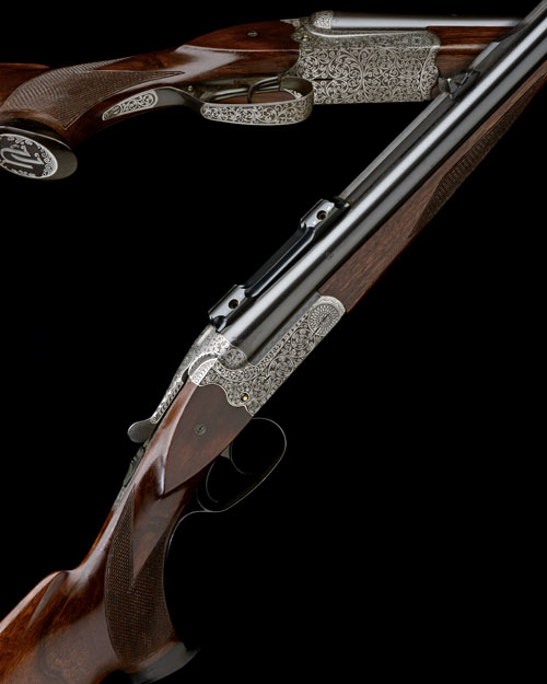 23 5/8in. (60cm) Krupp steel nitro barrels (proof marks for 2003), stepped matt top-rib with open sights and folding leaf sight, ramped blade fore-sight, the breech end with quickly-detachable telescopic sight mount rail, bolstered scroll-back treble-grip action with side-clips, removable striker discs, automatic safety, gold pin cocking-indicators, deeply carved in relief with bold Germanic scrollwork on a matt background, old silver finish, 15in. figured pistolgrip stock with cheekpiece, birdshead darkwood pistolgrip-cap inlaid with scrollwork and 'JU' monogram, sling eyes, 1in. rubber recoil pad, weight 11lb. 12oz.