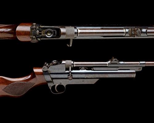 circa 1937, with blued detachable 25 1/2in. sighted barrel, bolt-action unlocking, air-chamber with five countries patent stamp, aperture rear-sight to rear of receiver, walnut chequered saw-grip butt-stock, horn heel-plate and retaining a strong amount of original blued finish with some surface frosting