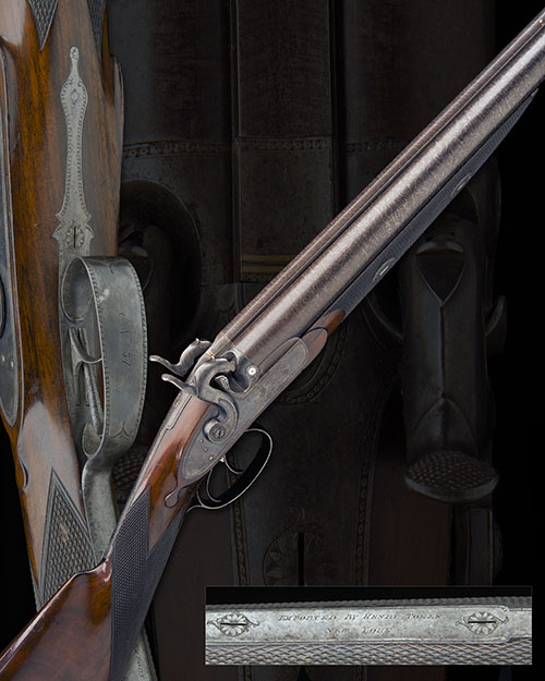 circa 1840, with browned twist-iron 36in. barrels, the top-rib signed 'STEPHEN TABER, ROSLYN L.I. BEST LAMINATED STEEL', silver fore-sight bead and ivory centre-bead, engraved borders and twin gold lines to the colour-hardened breech-block, moulded fences with platinum vented plugs, border engraved colour-hardened top-tang with engraved screws, colour-hardened border engraved bar-action locks signed 'WILLIAM MOORE, MAKER', border engraved hammers with carved peaks and chequered spurs, chequered walnut half-stock, colour-hardened border-engraved iron heel-plate, colour-hardened serial numbered trigger-guard bow, the lower tang signed 'IMPORTED BY HENRY TOMES, NEW-YORK', twin barrel keys with engraved oval escutcheons and brass-mounted wood ramrod, the whole retaining much original colour and finish throughout