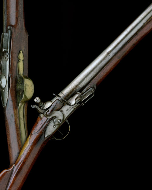 dated for 1777 and manufactured during the American War of Independence, with a possibly shortened 38in. round iron barrel, marked at breech 'MS' over '1777' (for Massachusetts), solid flared top-tang, military style plain lock signed forwards of the hammer 'MOSES BABCOCK', cast-off walnut handrail three-quarter butt-stock, carved apron around the top-tang, inlet brass escutcheon to wrist, brass heel-plate, trigger-guard and side-plate, brass ramrod throat and two rolled end thimbles (worn), brass fore-end tip (split) and replacement ramrod, losses to edges of fore-end, majority of the barrel cross-pins missing