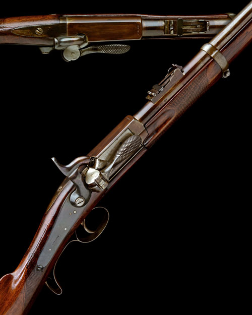 circa 1860 and possibly for trials, with London proved round 35in. barrel, block and blade fore-sight, elevating ladder rear-sight, shaped receiver stamped 'ENFIELD' to the top with swing out reverse loading breech-block operating on an articulated chequered bolt, plain back-action lock stamped 'ENFIELD', plain side hammer, chequered military-style three-quarter stock, iron furniture including pistol-grip tang trigger-guard, three iron barrel-bands and jag-ended iron under-barrel clearing rod