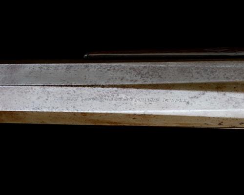 circa 1885, the substantial round to octagonal barrel marked along the top-flat 'NO1, THE LINE THROWING GUN CO. LIMITED, DUNDEE' (some discolouration and mild pitting), the rear of breech with circular aperture to accept the tail of a harpoon, the wrist with swinging brass shield, plain unsigned colour-hardened bar-action lock, heavy walnut half-stock with chequered pistol-grip, iron heel-plate, trigger-guard and fore-end cap; COMPLETE WITH an original iron harpoon with loop for line attachment, the hardened arrow-type head with brass side weights