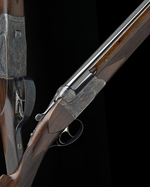 26 3/4in. nitro barrels with 6mm solid matt top-rib, 3in. chambers, bored approx. 1/4 and 1/2 choke, three-piece fore-end, bolstered scroll-back action, manual safety with gold-inlaid 'S' detail, articulated front trigger, border and scroll engraving, the triggerplate signed 'R. Smeets. Grar. Inr. S.M. Le Roi.', retaining much original colour-hardening and finish, 14 1/4in. stock with sling swivels, weight 5lb. 5oz., together with a leather leg of mutton guncase