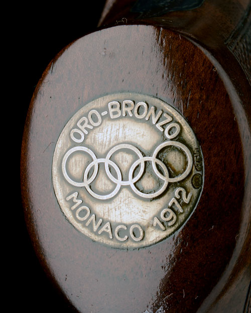 28in. nitro reproved barrels (in 2015) with 10mm ventilated matt top-rib, 3in. chambers, bored approx. 1/2 and full choke, hold-open toplever, manual safety, border and partial scroll engraving, bright finish, 14 1/2in. figured pistolgrip stock including 1in. ventilated rubber recoil pad, the pistolgrip cap with inlaid escutcheon bearing the Olympic rings and 'ORO-BRONZO MONACO 1972', weight 7lb. 3oz.