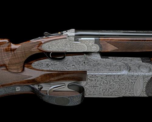 29in. 'Boehler Antinit' steel nitro barrels with 9mm ventilated matt top-rib, 2 3/4in. chambers, bored approx. 1/4 and full choke, hold-open toplever gold-inlaid with a crown and pierced with a bloom, manual safety with gold-inlaid 'S' detail, hand-detachable lockplates with concealed flush-fitting release catches, floral acanthus scrollwork set against a matt background, 14 1/4in. figured pistolgrip stock including 1 1/8in. ventilated rubber recoil pad and extension, weight 8lb. 1oz., in a tan leather case
